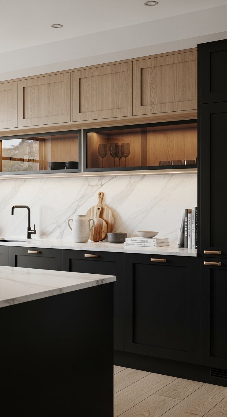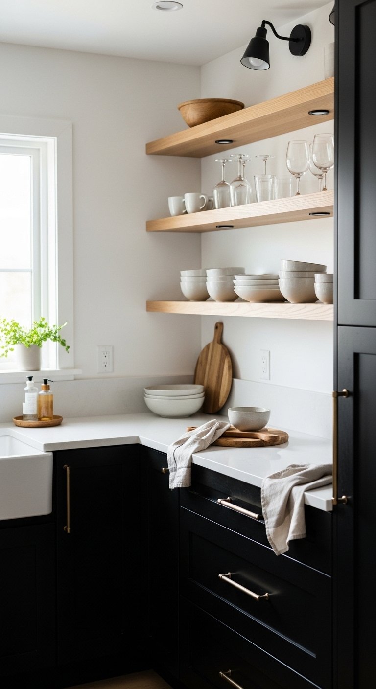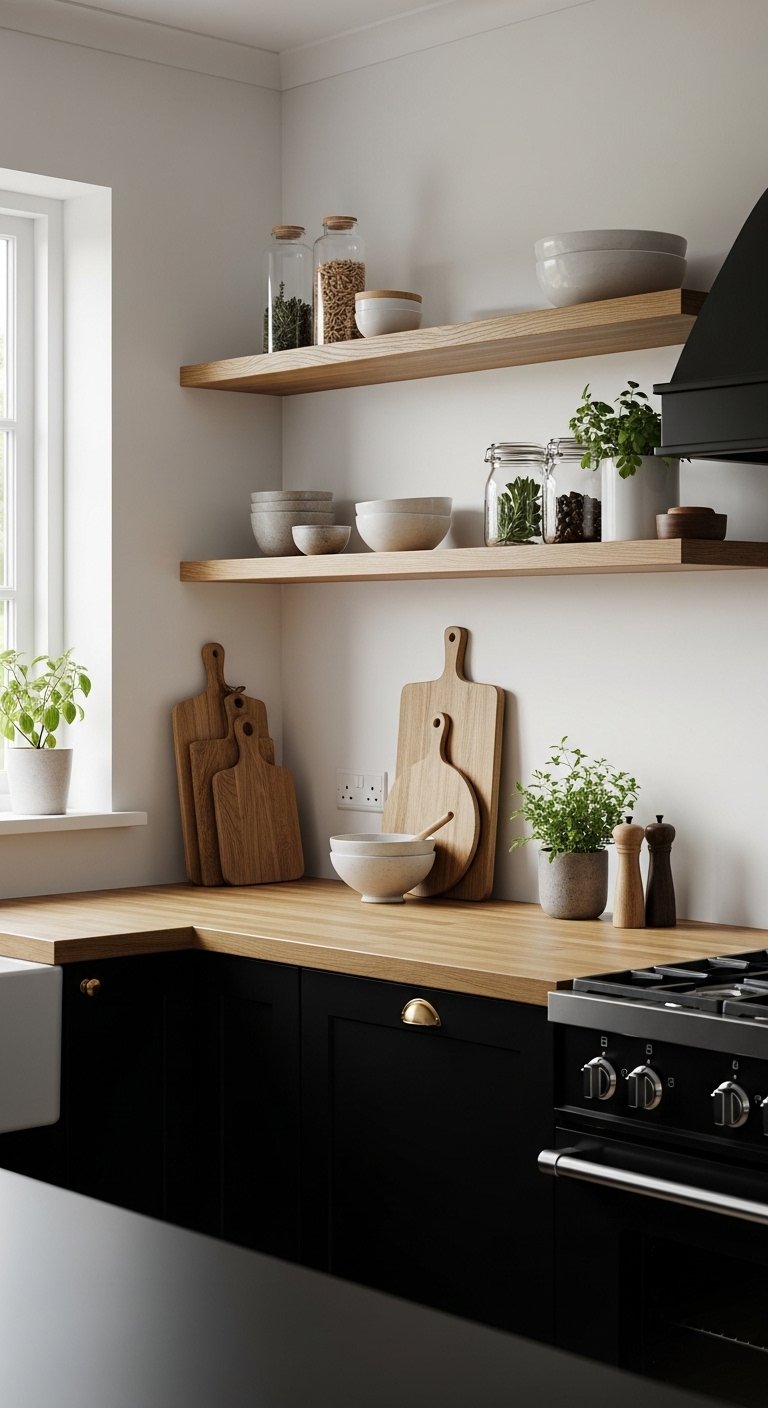 Black cabinetry gains warmth and balance when paired with natural wood. Think floating shelves, butcher block countertops, or walnut islands that introduce texture and organic elegance. Wood tones soften the boldness of black, making the kitchen feel inviting and lived-in without sacrificing luxury. Display ceramics, glassware, or plants on open wood shelves for visual interest. This mix of materials elevates the space, creating depth, texture, and a curated aesthetic perfect for Pinterest inspiration. The tactile contrast between wood and black cabinetry ensures the kitchen feels layered, timeless, and effortlessly sophisticated.