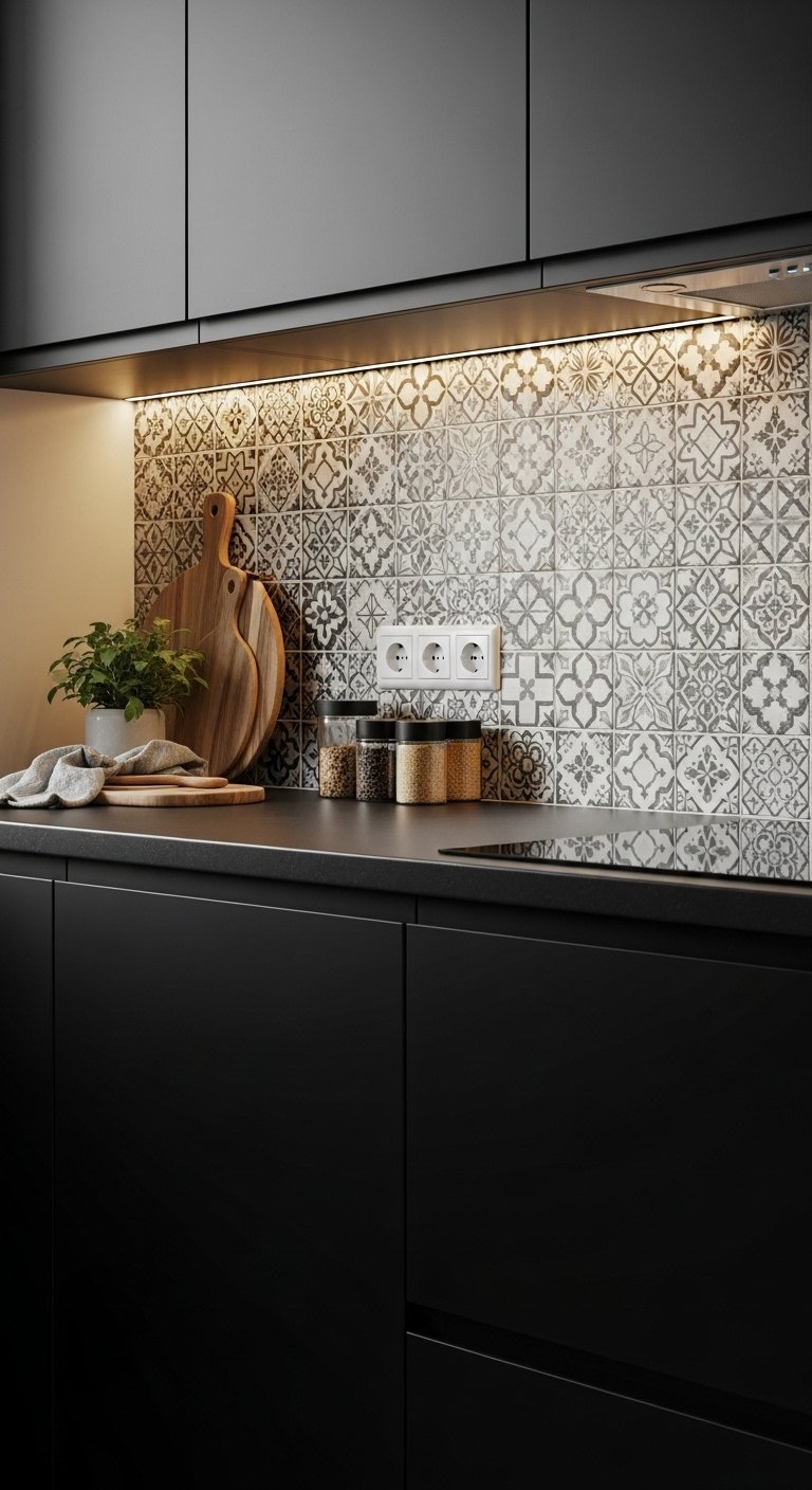A black subway tile backsplash adds texture, rhythm, and modern sophistication to a black kitchen. Opt for glossy, textured, or beveled tiles to catch light and create visual movement. Pair with lighter countertops, such as white quartz or marble, to prevent heaviness and keep the room bright. This backsplash serves as a subtle architectural statement, complementing dark cabinets and metallic accents. Strategically placed under-cabinet lighting enhances reflections and highlights the tile’s texture. The result is a Pinterest-perfect mix of classic and contemporary design, offering depth, elegance, and timeless appeal that transforms a kitchen from ordinary to high-end editorial-ready.