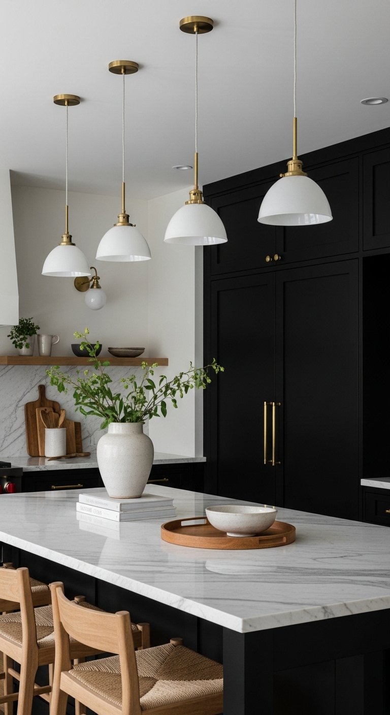 Dramatic lighting transforms a black kitchen from moody to elegant. Oversized pendant lights, chandeliers, or sculptural fixtures become visual art pieces that elevate the space. Position lighting above islands, dining nooks, or prep areas to highlight textures, countertops, and cabinetry. Mixing materials—glass, brass, or black metal—adds sophistication. Layered lighting, including ambient, task, and accent sources, ensures the kitchen is functional and stylish. Pinterest users are drawn to kitchens that combine dark elegance with thoughtful illumination, achieving a balance of luxury, drama, and warmth.