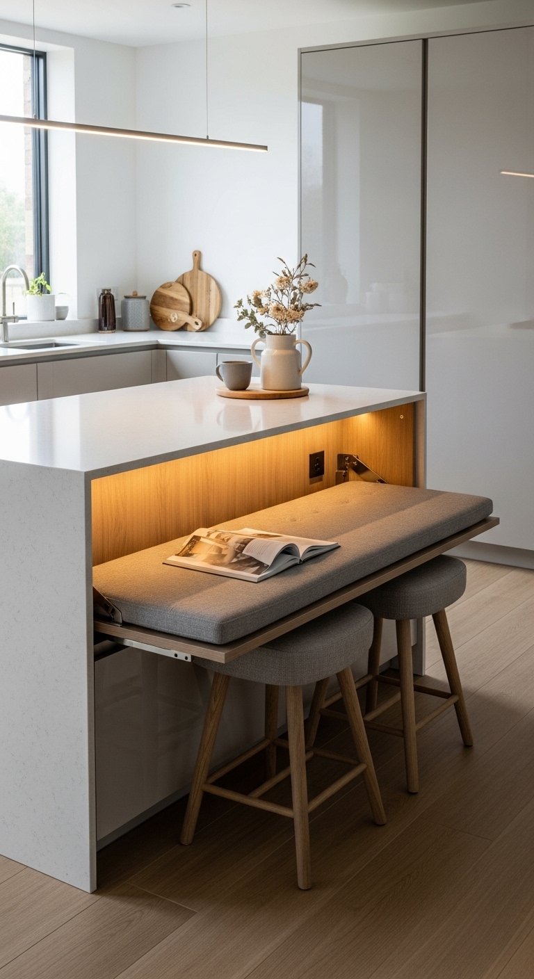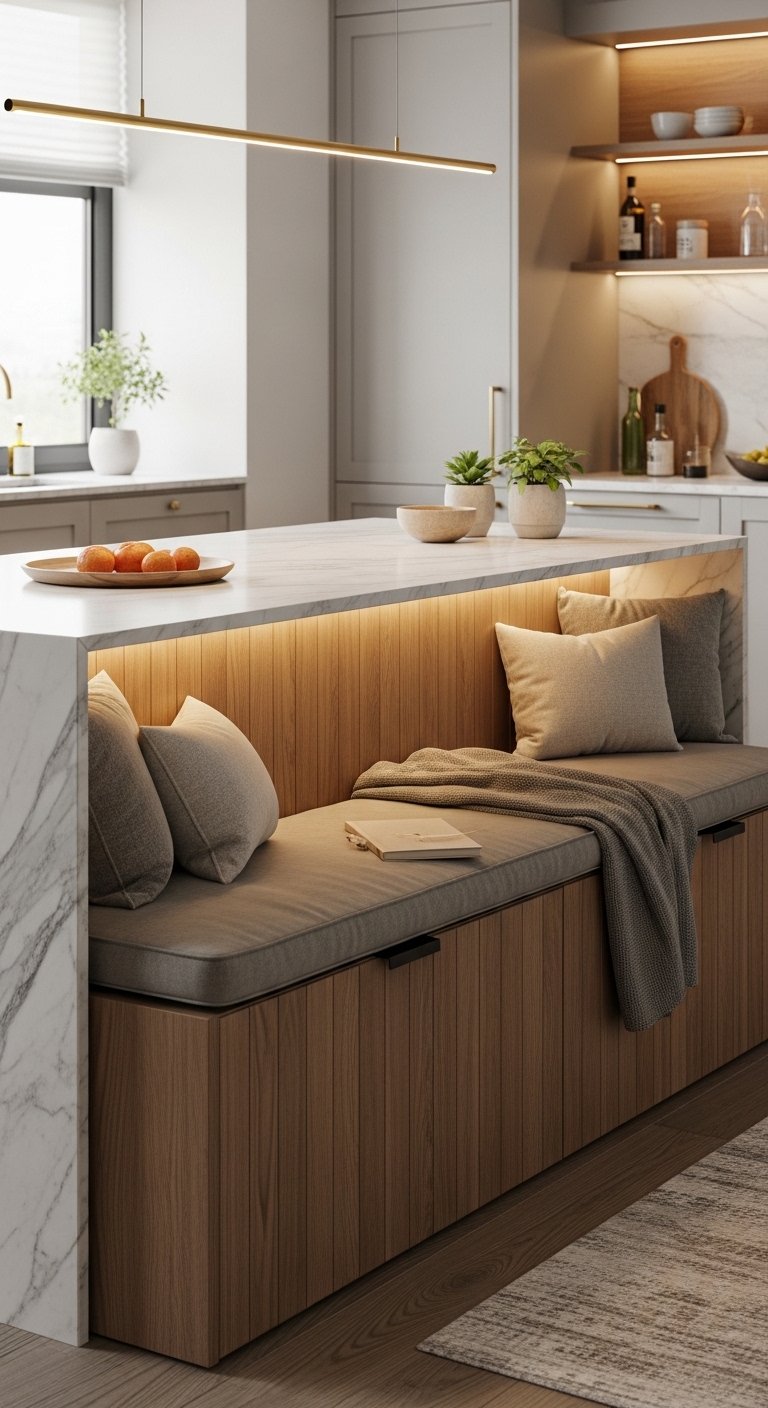 Extend a kitchen island into a storage bench with seating for a multi-functional modern layout. The bench provides casual dining or lounging space while offering hidden storage for kitchen linens, cookbooks, or small appliances. A marble countertop paired with wood paneling adds warmth and elegance. Add pendant lighting above to define the area visually. Cushions and small décor items like potted plants or fruit bowls make the space inviting and practical. This design transforms a standard island into a social, functional centerpiece that balances style, comfort, and storage. Perfect for Pinterest inspiration, it demonstrates clever use of space while maintaining a modern, open kitchen aesthetic.