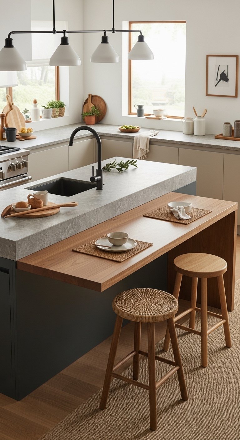 Combine a kitchen island with a cozy breakfast nook for ultimate multi-functionality. Extend one side of the island into a built-in seating area with a cushioned bench or banquette. Use a polished wood countertop for the nook and contrasting stone for the prep zone to define the spaces visually. Add soft pendant lights and a small rug to delineate the breakfast corner. This setup encourages casual dining, homework sessions, or intimate chats while maintaining an open, airy feel. Incorporating seating directly into the island maximizes space efficiency and creates a Pinterest-worthy, family-friendly focal point. Layer in decorative elements like herb pots, small bowls, or fresh flowers to make the space inviting and visually dynamic.