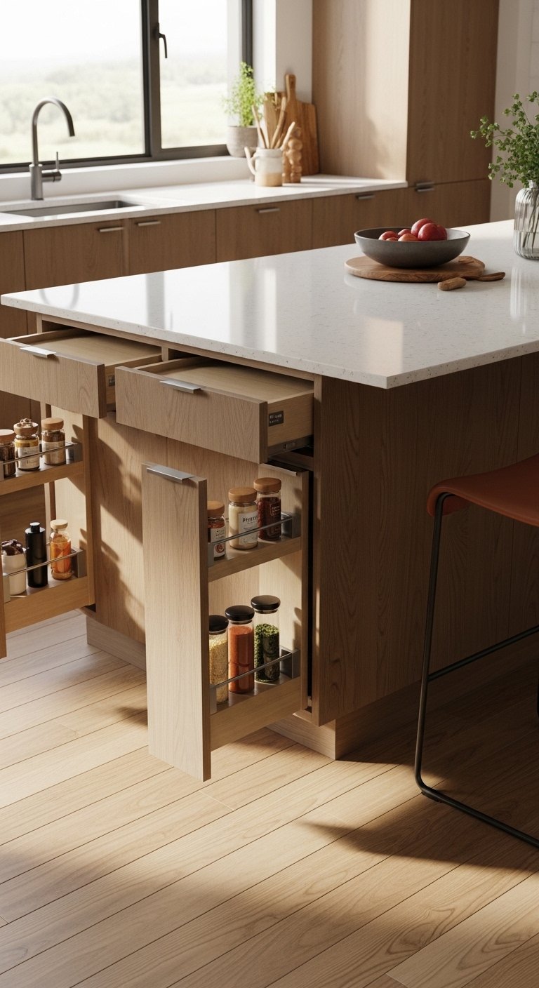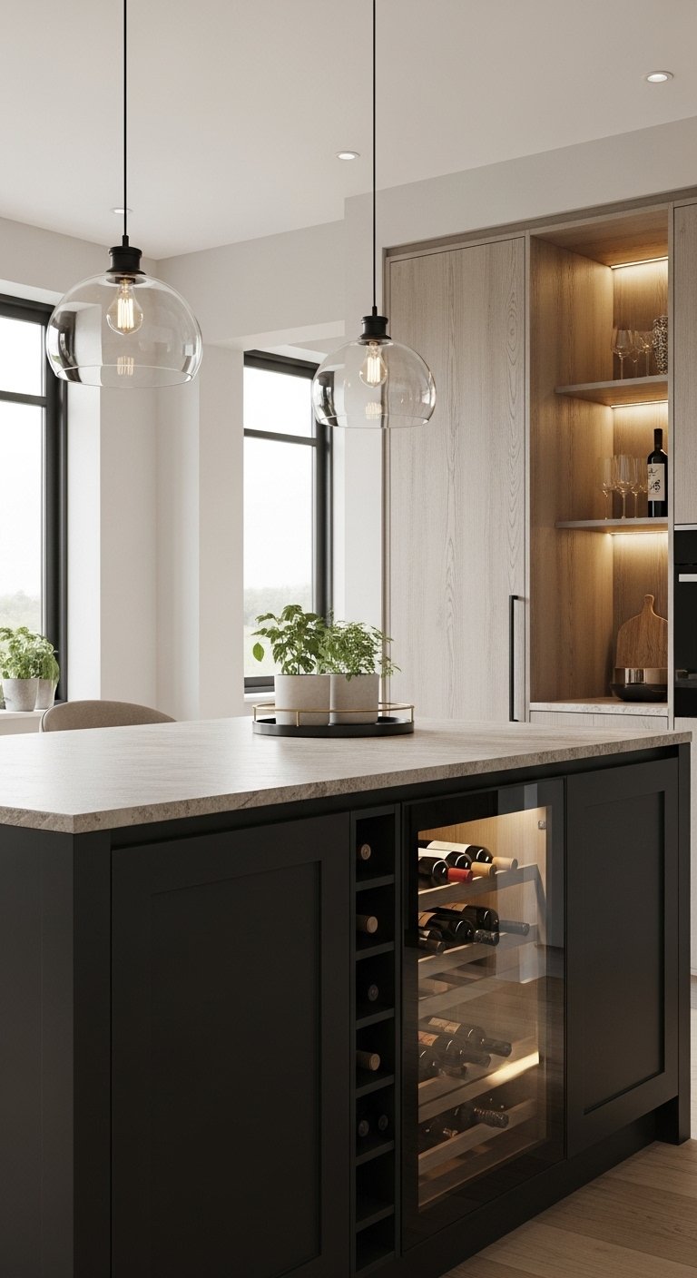 Maximize entertaining potential with a kitchen island that includes concealed wine storage. Integrate cubbies or temperature-controlled drawers into one side, keeping bottles easily accessible yet hidden for a clean look. Pair dark cabinetry with a light stone countertop to highlight the storage subtly. Add warm pendant lights to emphasize the textured materials. The island remains multifunctional, serving as prep space, casual dining, and a social hub, while the hidden wine feature adds an element of sophistication and surprise. Decorative accents like a small herb pot or elegant tray make the space feel lived-in and Pinterest-worthy. This design blends practicality, style, and entertaining efficiency seamlessly.