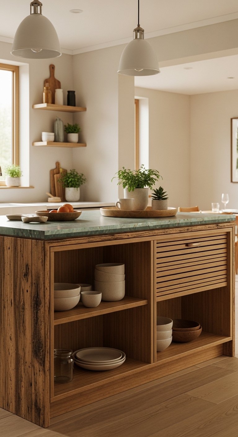 Incorporate sustainable materials for a modern, eco-conscious island. Use reclaimed wood for the base, bamboo accents for seating, and recycled glass or composite countertops. A soft matte finish keeps the textures natural and Pinterest-worthy, while energy-efficient LED underlighting enhances warmth. Open shelving can display organic ceramics, herbs, or eco-friendly kitchen tools, adding visual interest. This design emphasizes sustainability without sacrificing style or functionality. Pair the island with stools made of natural fibers and neutral tones to maintain a cohesive, calming aesthetic. Integrating greenery or indoor plants further enhances the environmental vibe. A sustainable island demonstrates that responsible design can be visually captivating, practical, and Pinterest-ready, creating a modern kitchen hub that reflects conscious lifestyle choices while remaining highly functional and inviting.
