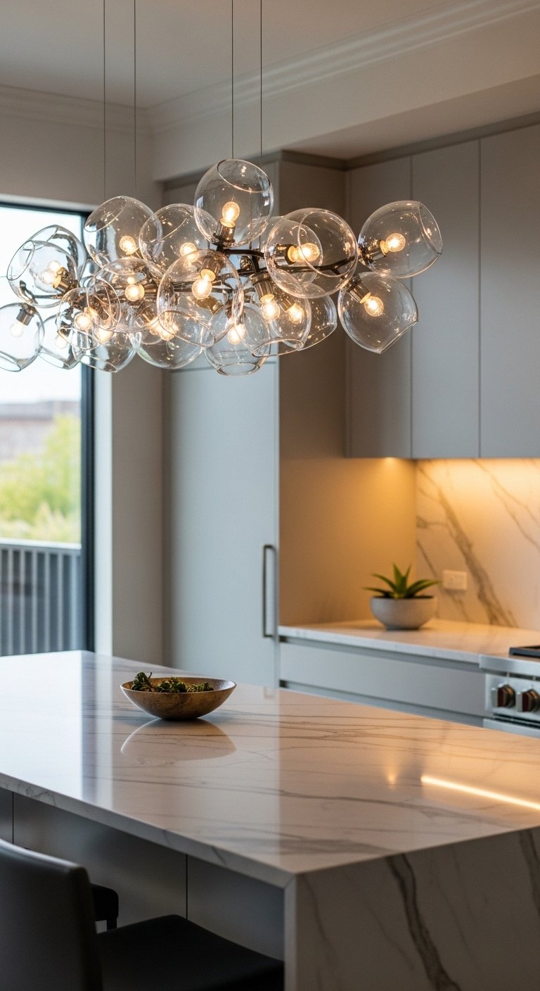 Make your island a visual centerpiece with a statement lighting sculpture above it. Consider a cluster of hanging glass or metal pendants, or an artistic chandelier that doubles as décor. Pair this with a sleek, marble or quartz island countertop and neutral-toned cabinetry to keep focus on the lighting. The sculptural element adds drama and Pinterest-worthy flair while maintaining functionality for prep or casual dining. Layer soft under-counter lighting to enhance texture and warmth. Complement the setup with minimal, tactile décor like wooden bowls, ceramic pots, or fresh flowers. This approach creates an open kitchen island that is both functional and a design showpiece, turning everyday tasks into a visually inspiring experience.