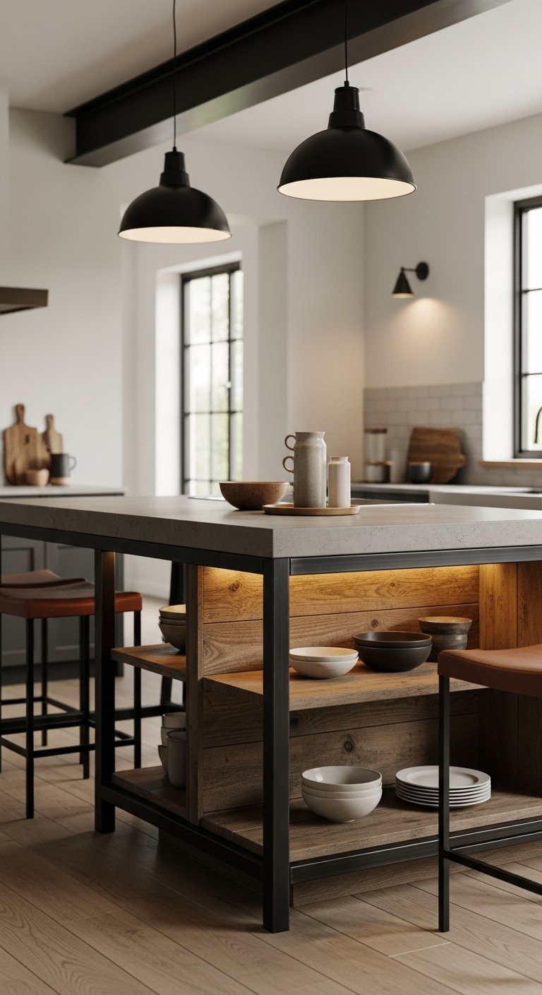 Combine reclaimed wood and matte black metal for an industrial-modern island that’s warm and functional. A solid wood countertop adds tactile warmth, while metal framing emphasizes clean lines and durability. Open shelving under the counter showcases cookbooks, ceramics, or baskets, giving the island a lived-in, approachable vibe. Overhead, minimalist black pendants create soft task lighting while highlighting textures. The combination of rough wood with sleek metal is visually captivating and highly practical, balancing style and function. This design appeals to those who want an edgy, Pinterest-ready open kitchen without sacrificing usability. Add bar stools with leather seats to complement the industrial theme while maintaining comfort and accessibility.