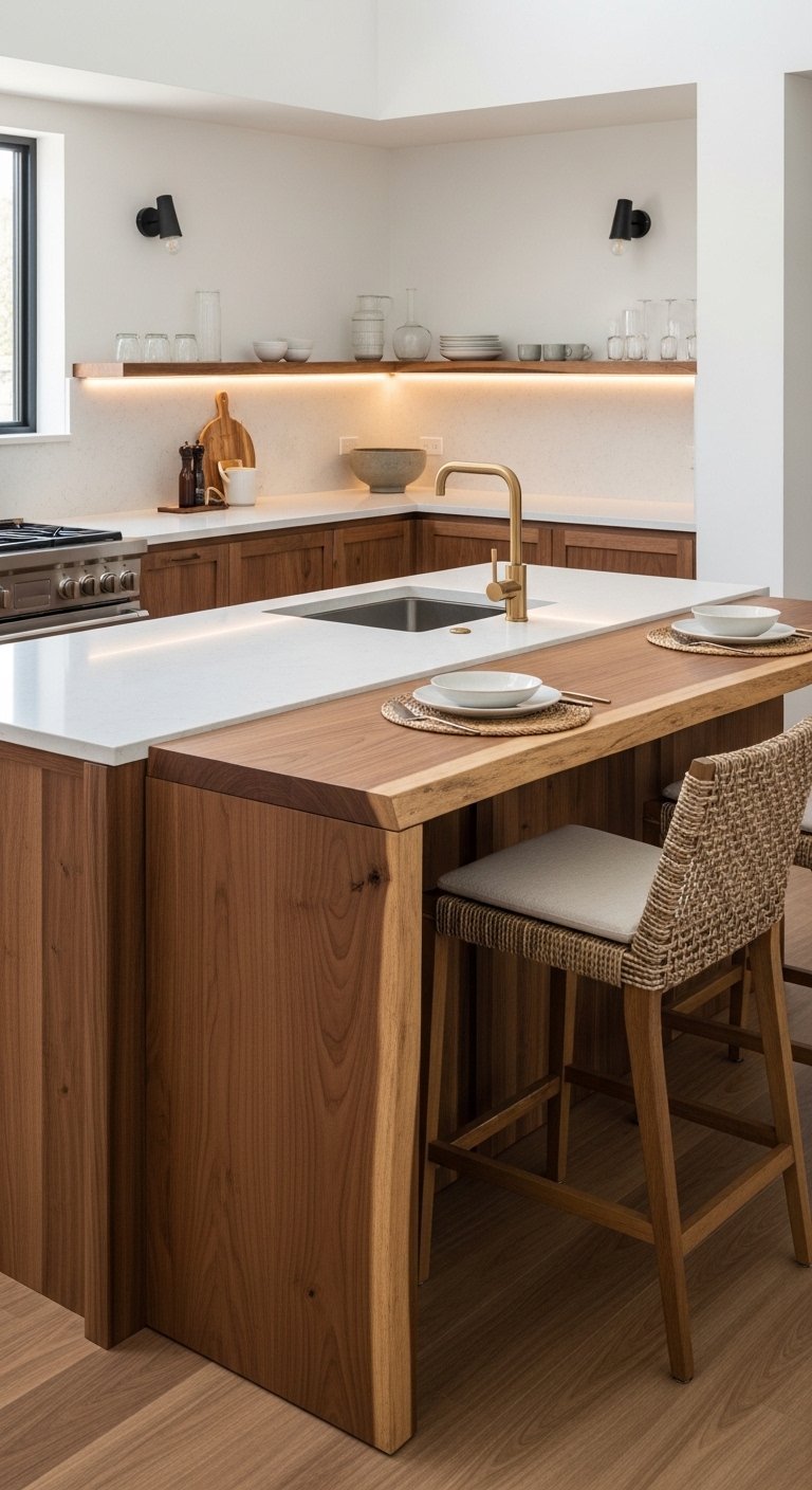Combine contrasting textures for a modern yet cozy island by pairing a rich walnut base with a light quartz countertop. Extend one end with a live-edge wooden slab to serve as a breakfast nook or casual dining space. This tactile mix invites touch and adds visual interest, creating a warm, Pinterest-worthy focal point. Complement the materials with woven rattan bar stools and a neutral-toned rug underneath to ground the space. Add soft LED strip lighting under the countertop edge to subtly illuminate the textures. Small décor like ceramic bowls, fresh herbs, or artisanal cutting boards enhances the natural feel. A mixed-material island balances practicality, style, and sensory appeal, making the kitchen not only functional but also inviting, cozy, and visually dynamic—a space people will want to pin and recreate.